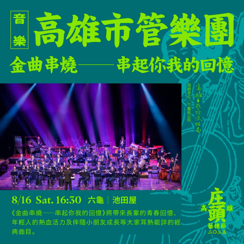 六龜區8月16日(六)16時30分池田屋邀請高雄市管樂團金曲串燒,將帶來長輩的青春回憶、年輕人的熱血活力及伴隨小朋友成長等大家耳熟能詳的經典曲目厝邊頭尾相招來,鬥陣來看庄頭音樂會!「高雄的庄頭,就是幸福相聚的舞台!」 節目場次詳情請上 高雄市政府文化局官網(http://www.khcc.gov.tw)今仔日咱就約庄頭見~一起感受藝術的溫度!#庄頭藝穗節 #高雄文化力 #藝起走庄 #庄頭音樂會 #週末有約